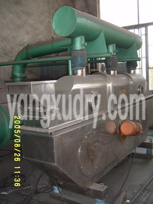 物料自进料进口进入机内,在振动力作用下,物料沿水平面流化床抛掷,向前连续运动,热风向上穿过流化床同湿物料换热后,湿空气经旋风分离器除尘后由排风1:3排出,干燥物料由排料进口排出。