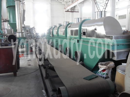 物料自进料进口进入机内,在振动力作用下,物料沿水平面流化床抛掷,向前连续运动,热风向上穿过流化床同湿物料换热后,湿空气经旋风分离器除尘后由排风1:3排出.干燥物料由排料进口排出。